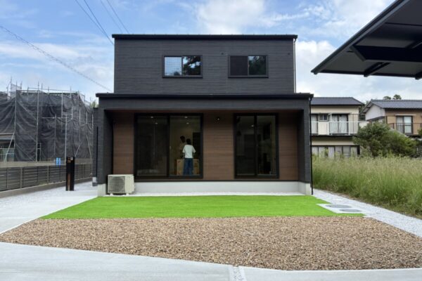 こんにちは。 スズイチ住宅事業部の井ノ口です。 菊川市で建築が進められていますI様邸ですが、足場が外されて建物の全景が確認できるようになりました。 全体を濃い色でまとめられモダンな外